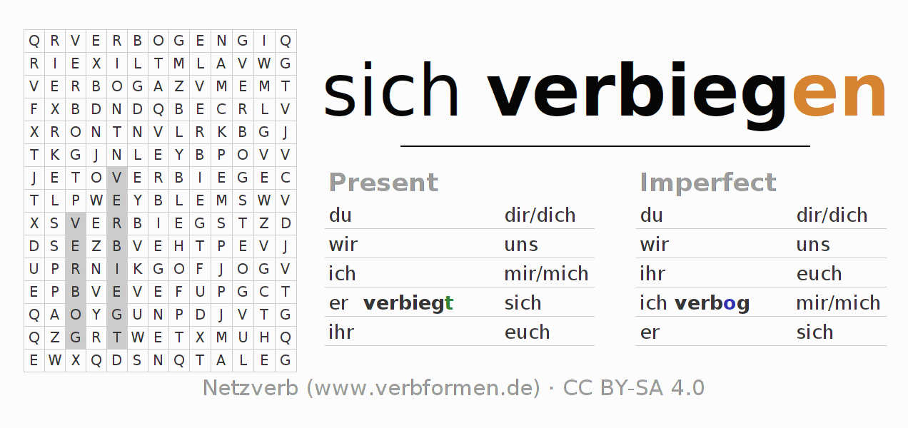 With these search word puzzles you can learn the conjugation of the German verb sich verbiegen.