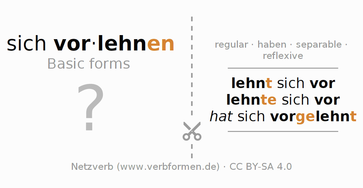 Worksheets are used generally for the conjugation of the verb vorlehnen in teaching. The materials can be used as Open Educational Resources (OER) for exercises, for games and as Tasks (CC BY-SA 4.0). There are many different types of tasks available for the verb sich vorlehnen. These are overview sheets with complete conjugation, puzzles and games that require joint learning. The entire educational material is available for free as a PDF download, as pictures and as an interactive browser version. In addition to the tasks, countless examples for vorlehnen also provide an aid to using the verb.