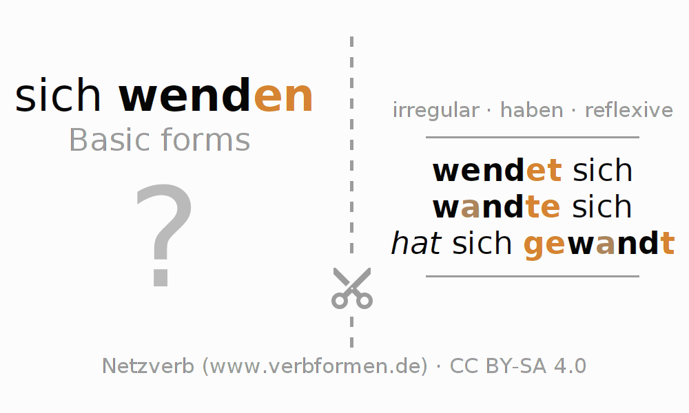 Worksheets are used generally for the conjugation of the verb wenden in teaching. The materials can be used as Open Educational Resources (OER) for exercises, for games and as Tasks (CC BY-SA 4.0). There are many different types of tasks available for the verb sich wenden (unr). These are overview sheets with complete conjugation, puzzles and games that require joint learning. The entire educational material is available for free as a PDF download, as pictures and as an interactive browser version. In addition to the tasks, countless examples for wenden also provide an aid to using the verb.