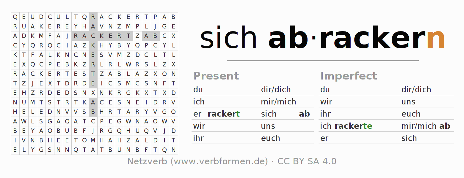 The word search puzzle for abrackern or short word search is used to playfully learn German conjugation. First of all, the individual verb forms of the verb sich abrackern must be created in order to find them in the letter grid. The reverse way is also possible. If one finds a flected verb in the search word puzzle, it is necessary to find out which verb form can be assigned. For printing and downloading, there is a PDF version or an image. There are also many more worksheets for the verb abrackern. All materials are available as Open Educational Resources (OER) under license CC BY- SA 4.0 and can be used free of charge.