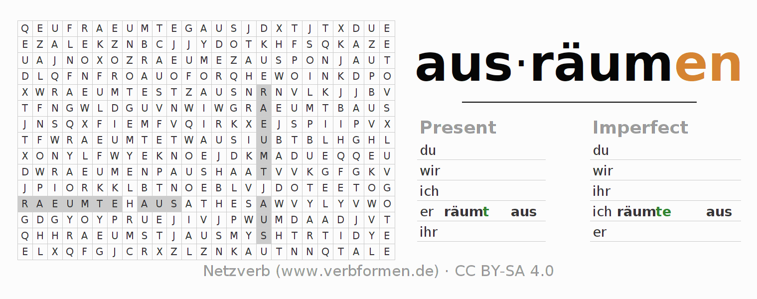 Instruction: Form the verb ausräumen and find it in the puzzle. Or recognize the flected form of ausräumen in the riddle and assign it to the correct verb form. Umlauts and ß are described as oe, ae and ue an ss.The solution is at the bottom of the page.