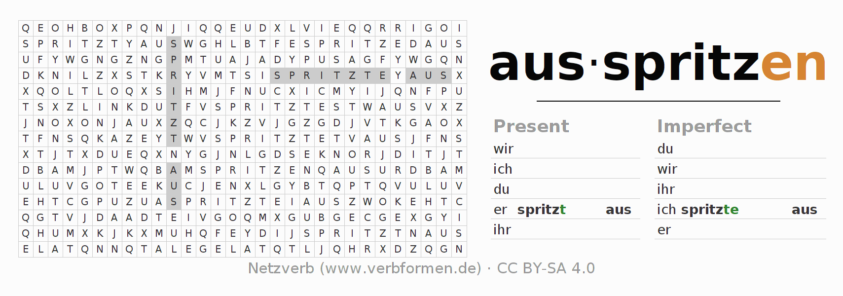 The word search puzzle for ausspritzen or short word search is used to playfully learn German conjugation. First of all, the individual verb forms of the verb ausspritzen must be created in order to find them in the letter grid. The reverse way is also possible. If one finds a flected verb in the search word puzzle, it is necessary to find out which verb form can be assigned. For printing and downloading, there is a PDF version or an image. There are also many more worksheets for the verb ausspritzen. All materials are available as Open Educational Resources (OER) under license CC BY- SA 4.0 and can be used free of charge.
