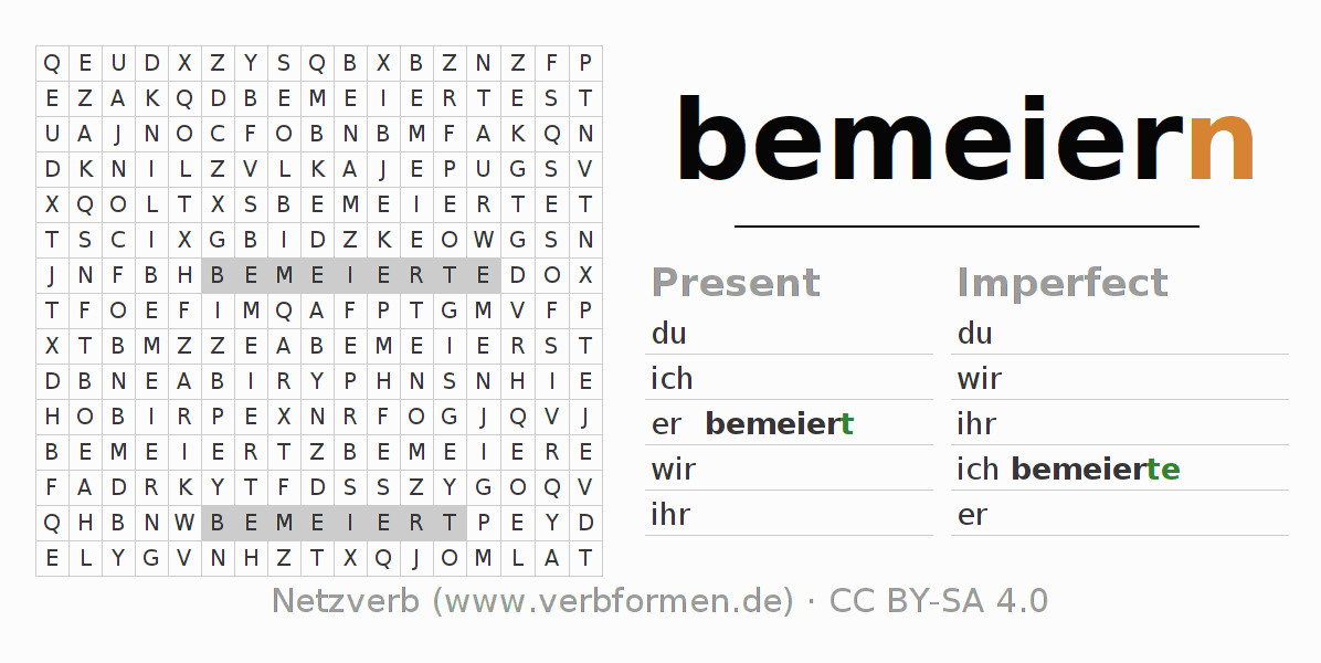 The word search puzzle for bemeiern or short word search is used to playfully learn German conjugation. First of all, the individual verb forms of the verb bemeiern must be created in order to find them in the letter grid. The reverse way is also possible. If one finds a flected verb in the search word puzzle, it is necessary to find out which verb form can be assigned. For printing and downloading, there is a PDF version or an image. There are also many more worksheets for the verb bemeiern. All materials are available as Open Educational Resources (OER) under license CC BY- SA 4.0 and can be used free of charge.