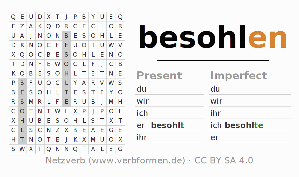 The word search puzzle for besohlen or short word search is used to playfully learn German conjugation. First of all, the individual verb forms of the verb besohlen must be created in order to find them in the letter grid. The reverse way is also possible. If one finds a flected verb in the search word puzzle, it is necessary to find out which verb form can be assigned. For printing and downloading, there is a PDF version or an image. There are also many more worksheets for the verb besohlen. All materials are available as Open Educational Resources (OER) under license CC BY- SA 4.0 and can be used free of charge.