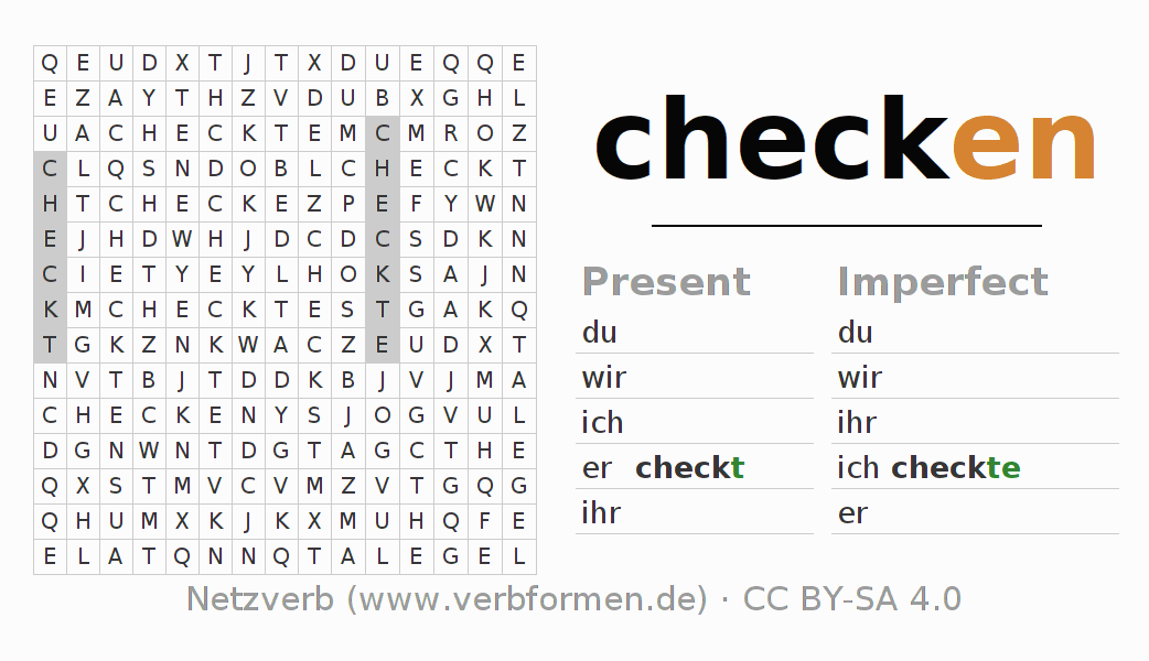 Instruction: Form the verb checken and find it in the puzzle. Or recognize the flected form of checken in the riddle and assign it to the correct verb form. Umlauts and ß are described as oe, ae and ue an ss.The solution is at the bottom of the page.