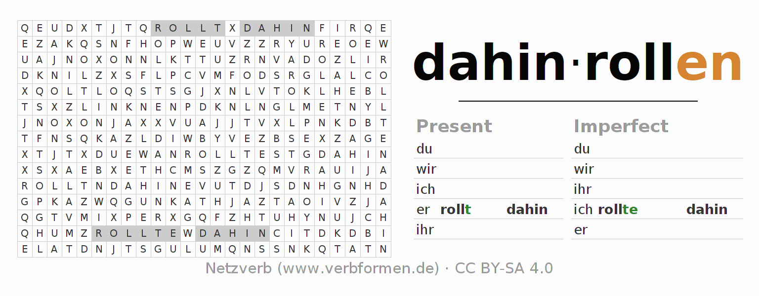The word search puzzle for dahinrollen or short word search is used to playfully learn German conjugation. First of all, the individual verb forms of the verb dahinrollen must be created in order to find them in the letter grid. The reverse way is also possible. If one finds a flected verb in the search word puzzle, it is necessary to find out which verb form can be assigned. For printing and downloading, there is a PDF version or an image. There are also many more worksheets for the verb dahinrollen. All materials are available as Open Educational Resources (OER) under license CC BY- SA 4.0 and can be used free of charge.