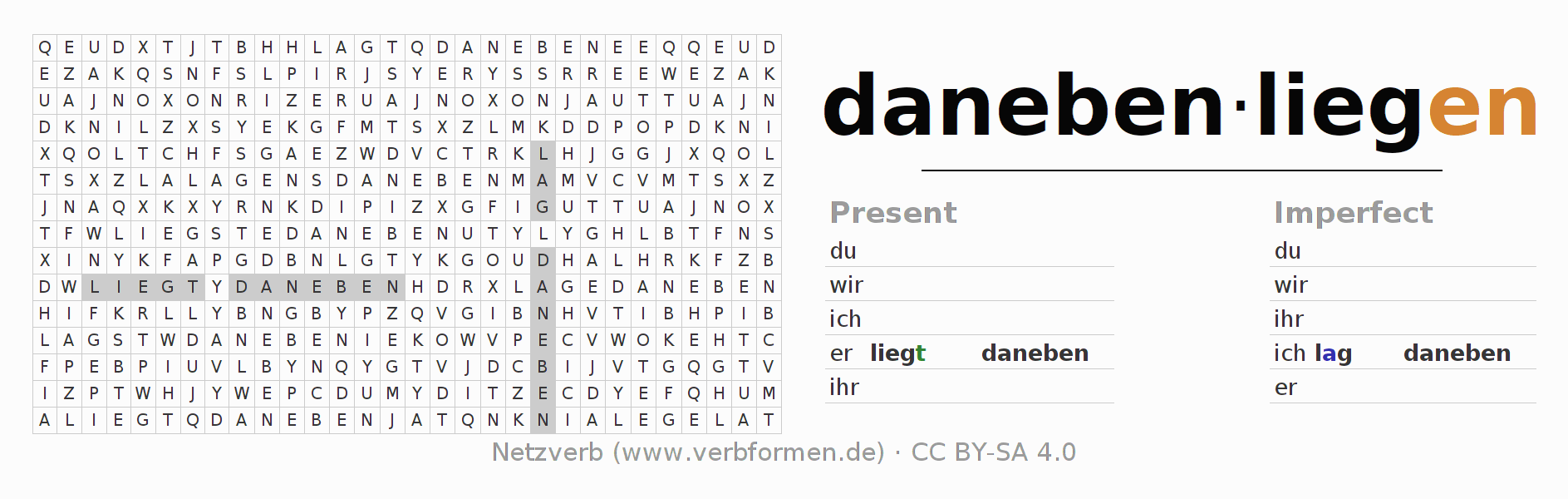 The word search puzzle for danebenliegen or short word search is used to playfully learn German conjugation. First of all, the individual verb forms of the verb danebenliegen (hat) must be created in order to find them in the letter grid. The reverse way is also possible. If one finds a flected verb in the search word puzzle, it is necessary to find out which verb form can be assigned. For printing and downloading, there is a PDF version or an image. There are also many more worksheets for the verb danebenliegen. All materials are available as Open Educational Resources (OER) under license CC BY- SA 4.0 and can be used free of charge.