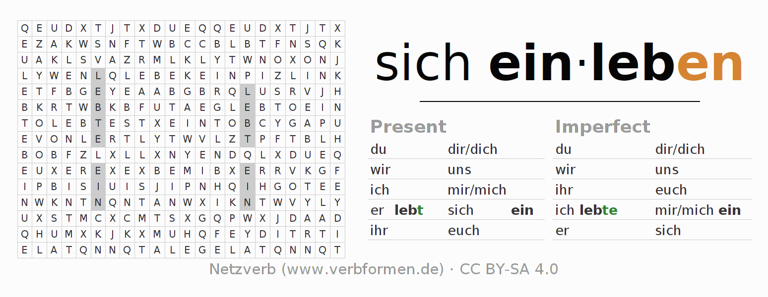The word search puzzle for einleben or short word search is used to playfully learn German conjugation. First of all, the individual verb forms of the verb sich einleben must be created in order to find them in the letter grid. The reverse way is also possible. If one finds a flected verb in the search word puzzle, it is necessary to find out which verb form can be assigned. For printing and downloading, there is a PDF version or an image. There are also many more worksheets for the verb einleben. All materials are available as Open Educational Resources (OER) under license CC BY- SA 4.0 and can be used free of charge.
