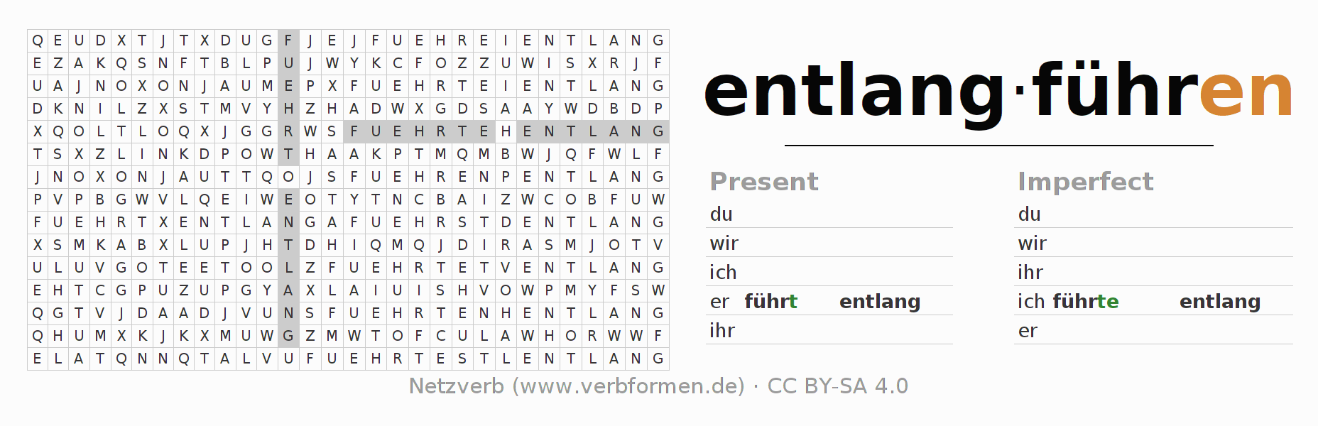 The word search puzzle for entlangführen or short word search is used to playfully learn German conjugation. First of all, the individual verb forms of the verb entlangführen must be created in order to find them in the letter grid. The reverse way is also possible. If one finds a flected verb in the search word puzzle, it is necessary to find out which verb form can be assigned. For printing and downloading, there is a PDF version or an image. There are also many more worksheets for the verb entlangführen. All materials are available as Open Educational Resources (OER) under license CC BY- SA 4.0 and can be used free of charge.