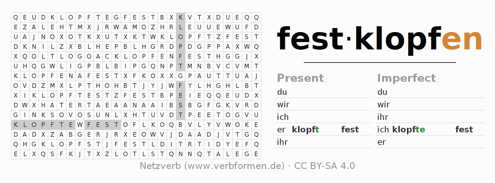 The word search puzzle for festklopfen or short word search is used to playfully learn German conjugation. First of all, the individual verb forms of the verb festklopfen must be created in order to find them in the letter grid. The reverse way is also possible. If one finds a flected verb in the search word puzzle, it is necessary to find out which verb form can be assigned. For printing and downloading, there is a PDF version or an image. There are also many more worksheets for the verb festklopfen. All materials are available as Open Educational Resources (OER) under license CC BY- SA 4.0 and can be used free of charge.