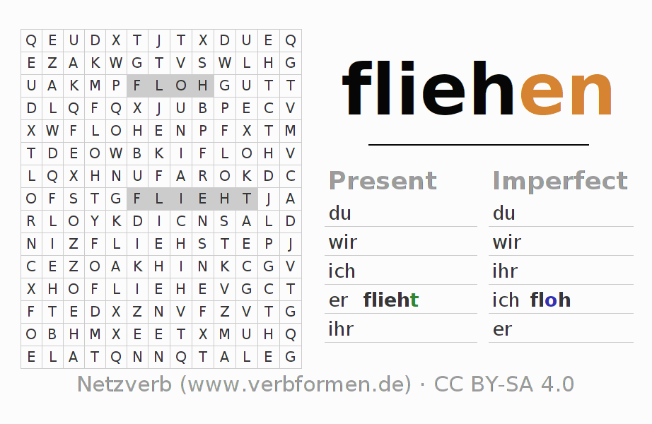 The word search puzzle for fliehen or short word search is used to playfully learn German conjugation. First of all, the individual verb forms of the verb fliehen (hat) must be created in order to find them in the letter grid. The reverse way is also possible. If one finds a flected verb in the search word puzzle, it is necessary to find out which verb form can be assigned. For printing and downloading, there is a PDF version or an image. There are also many more worksheets for the verb fliehen. All materials are available as Open Educational Resources (OER) under license CC BY- SA 4.0 and can be used free of charge.