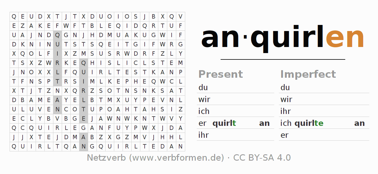 The word search puzzle for anquirlen or short word search is used to playfully learn German conjugation. First of all, the individual verb forms of the verb anquirlen must be created in order to find them in the letter grid. The reverse way is also possible. If one finds a flected verb in the search word puzzle, it is necessary to find out which verb form can be assigned. For printing and downloading, there is a PDF version or an image. There are also many more worksheets for the verb anquirlen. All materials are available as Open Educational Resources (OER) under license CC BY- SA 4.0 and can be used free of charge.