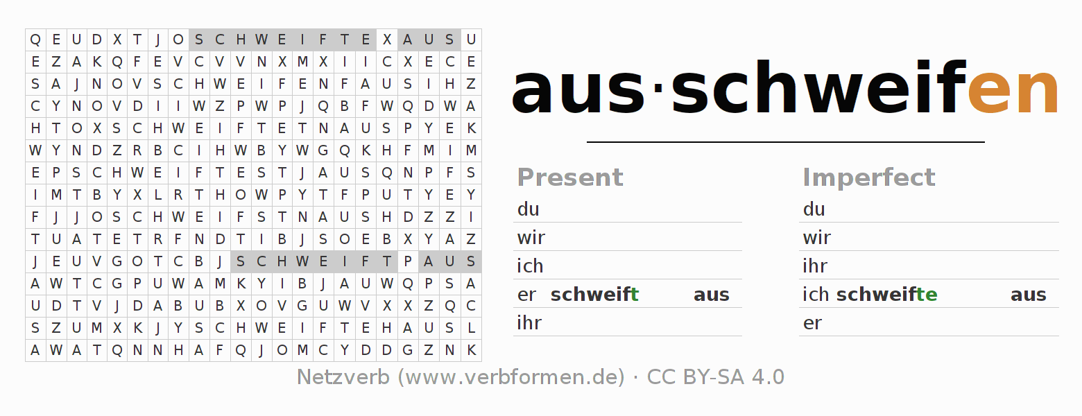 The word search puzzle for ausschweifen or short word search is used to playfully learn German conjugation. First of all, the individual verb forms of the verb ausschweifen (hat) must be created in order to find them in the letter grid. The reverse way is also possible. If one finds a flected verb in the search word puzzle, it is necessary to find out which verb form can be assigned. For printing and downloading, there is a PDF version or an image. There are also many more worksheets for the verb ausschweifen. All materials are available as Open Educational Resources (OER) under license CC BY- SA 4.0 and can be used free of charge.
