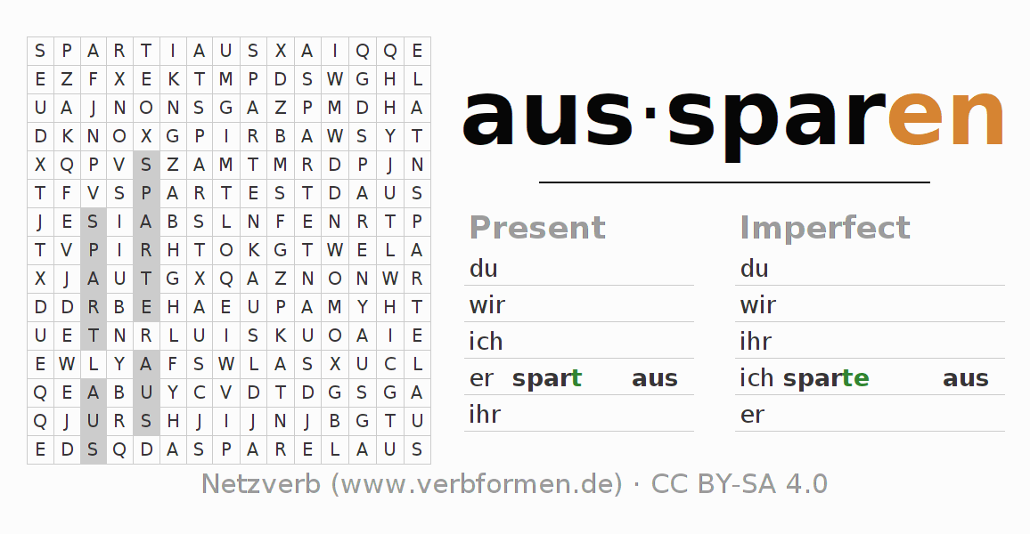 Instruction: Form the verb aussparen and find it in the puzzle. Or recognize the flected form of aussparen in the riddle and assign it to the correct verb form. Umlauts and ß are described as oe, ae and ue an ss.The solution is at the bottom of the page.