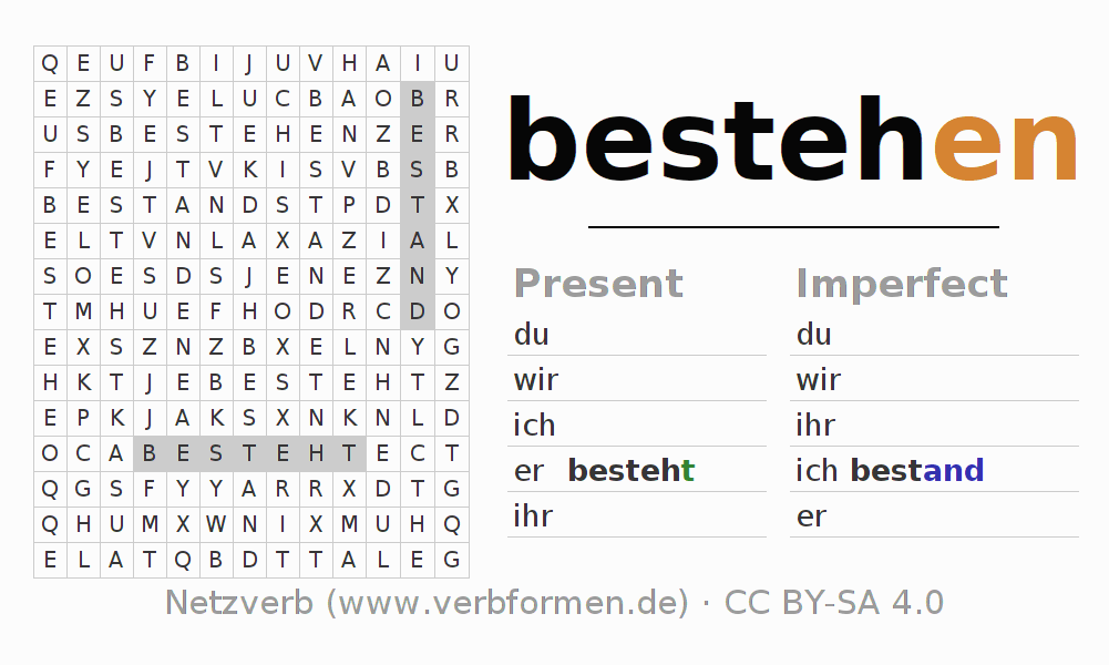 The word search puzzle for bestehen or short word search is used to playfully learn German conjugation. First of all, the individual verb forms of the verb bestehen must be created in order to find them in the letter grid. The reverse way is also possible. If one finds a flected verb in the search word puzzle, it is necessary to find out which verb form can be assigned. For printing and downloading, there is a PDF version or an image. There are also many more worksheets for the verb bestehen. All materials are available as Open Educational Resources (OER) under license CC BY- SA 4.0 and can be used free of charge.