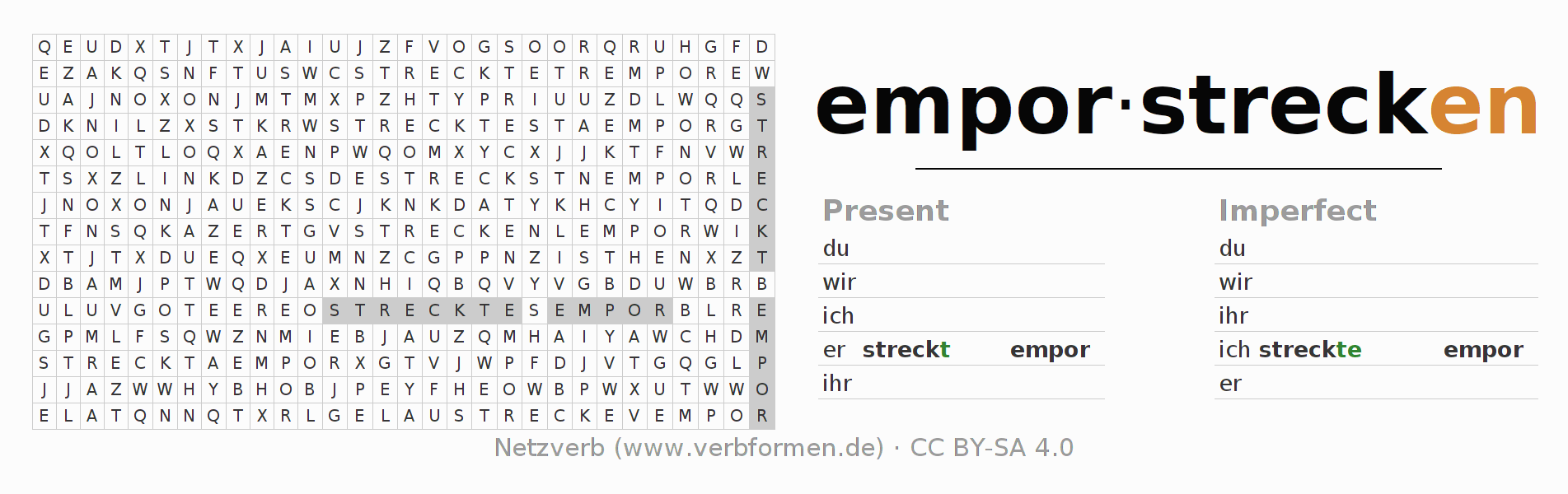 The word search puzzle for emporstrecken or short word search is used to playfully learn German conjugation. First of all, the individual verb forms of the verb emporstrecken must be created in order to find them in the letter grid. The reverse way is also possible. If one finds a flected verb in the search word puzzle, it is necessary to find out which verb form can be assigned. For printing and downloading, there is a PDF version or an image. There are also many more worksheets for the verb emporstrecken. All materials are available as Open Educational Resources (OER) under license CC BY- SA 4.0 and can be used free of charge.