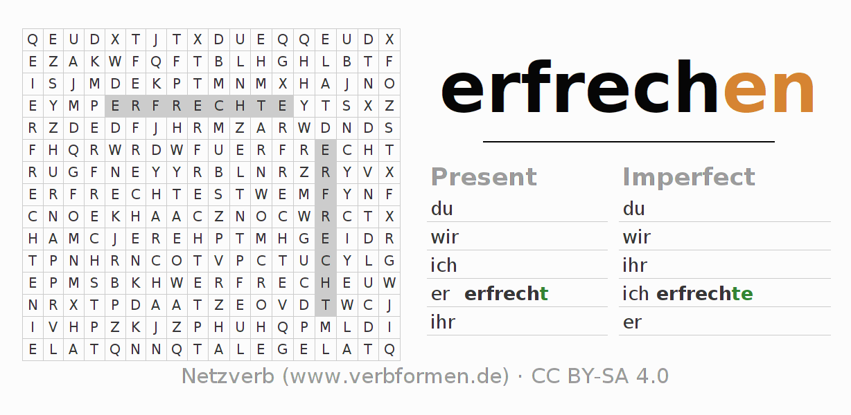 The word search puzzle for erfrechen or short word search is used to playfully learn German conjugation. First of all, the individual verb forms of the verb erfrechen must be created in order to find them in the letter grid. The reverse way is also possible. If one finds a flected verb in the search word puzzle, it is necessary to find out which verb form can be assigned. For printing and downloading, there is a PDF version or an image. There are also many more worksheets for the verb erfrechen. All materials are available as Open Educational Resources (OER) under license CC BY- SA 4.0 and can be used free of charge.