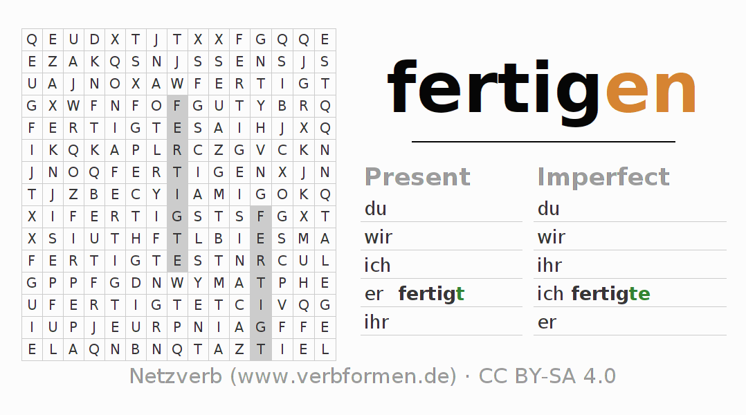 The word search puzzle for fertigen or short word search is used to playfully learn German conjugation. First of all, the individual verb forms of the verb fertigen must be created in order to find them in the letter grid. The reverse way is also possible. If one finds a flected verb in the search word puzzle, it is necessary to find out which verb form can be assigned. For printing and downloading, there is a PDF version or an image. There are also many more worksheets for the verb fertigen. All materials are available as Open Educational Resources (OER) under license CC BY- SA 4.0 and can be used free of charge.