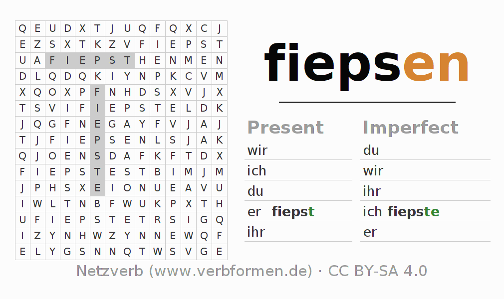 The word search puzzle for fiepsen or short word search is used to playfully learn German conjugation. First of all, the individual verb forms of the verb fiepsen must be created in order to find them in the letter grid. The reverse way is also possible. If one finds a flected verb in the search word puzzle, it is necessary to find out which verb form can be assigned. For printing and downloading, there is a PDF version or an image. There are also many more worksheets for the verb fiepsen. All materials are available as Open Educational Resources (OER) under license CC BY- SA 4.0 and can be used free of charge.