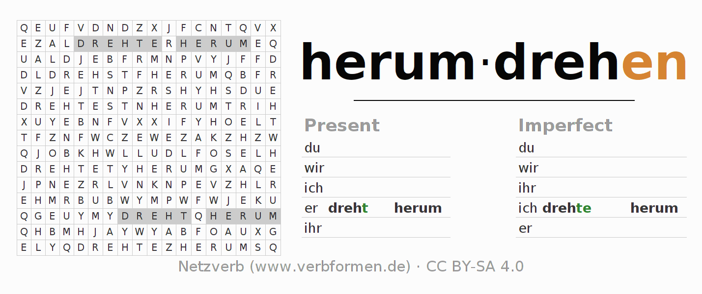 The word search puzzle for herumdrehen or short word search is used to playfully learn German conjugation. First of all, the individual verb forms of the verb herumdrehen must be created in order to find them in the letter grid. The reverse way is also possible. If one finds a flected verb in the search word puzzle, it is necessary to find out which verb form can be assigned. For printing and downloading, there is a PDF version or an image. There are also many more worksheets for the verb herumdrehen. All materials are available as Open Educational Resources (OER) under license CC BY- SA 4.0 and can be used free of charge.