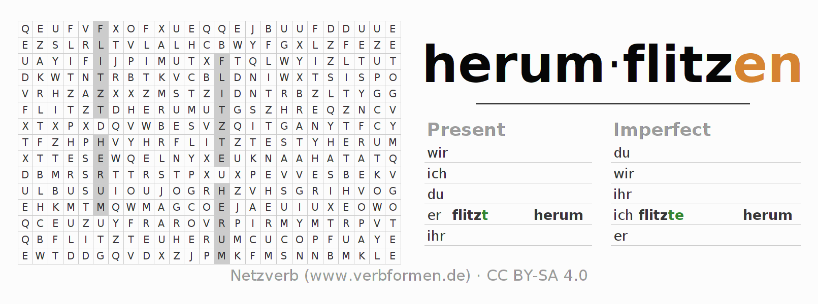 The word search puzzle for herumflitzen or short word search is used to playfully learn German conjugation. First of all, the individual verb forms of the verb herumflitzen must be created in order to find them in the letter grid. The reverse way is also possible. If one finds a flected verb in the search word puzzle, it is necessary to find out which verb form can be assigned. For printing and downloading, there is a PDF version or an image. There are also many more worksheets for the verb herumflitzen. All materials are available as Open Educational Resources (OER) under license CC BY- SA 4.0 and can be used free of charge.