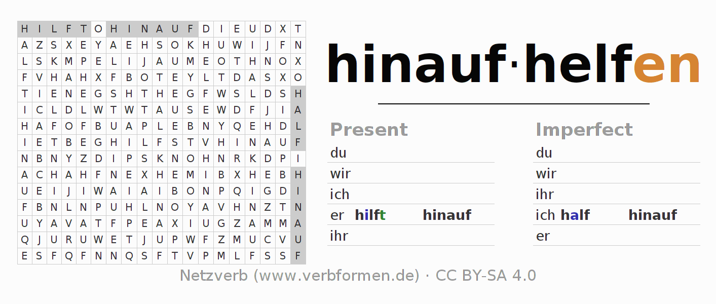 The word search puzzle for hinaufhelfen or short word search is used to playfully learn German conjugation. First of all, the individual verb forms of the verb hinaufhelfen must be created in order to find them in the letter grid. The reverse way is also possible. If one finds a flected verb in the search word puzzle, it is necessary to find out which verb form can be assigned. For printing and downloading, there is a PDF version or an image. There are also many more worksheets for the verb hinaufhelfen. All materials are available as Open Educational Resources (OER) under license CC BY- SA 4.0 and can be used free of charge.