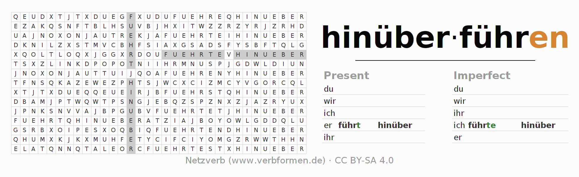 The word search puzzle for hinüberführen or short word search is used to playfully learn German conjugation. First of all, the individual verb forms of the verb hinüberführen must be created in order to find them in the letter grid. The reverse way is also possible. If one finds a flected verb in the search word puzzle, it is necessary to find out which verb form can be assigned. For printing and downloading, there is a PDF version or an image. There are also many more worksheets for the verb hinüberführen. All materials are available as Open Educational Resources (OER) under license CC BY- SA 4.0 and can be used free of charge.