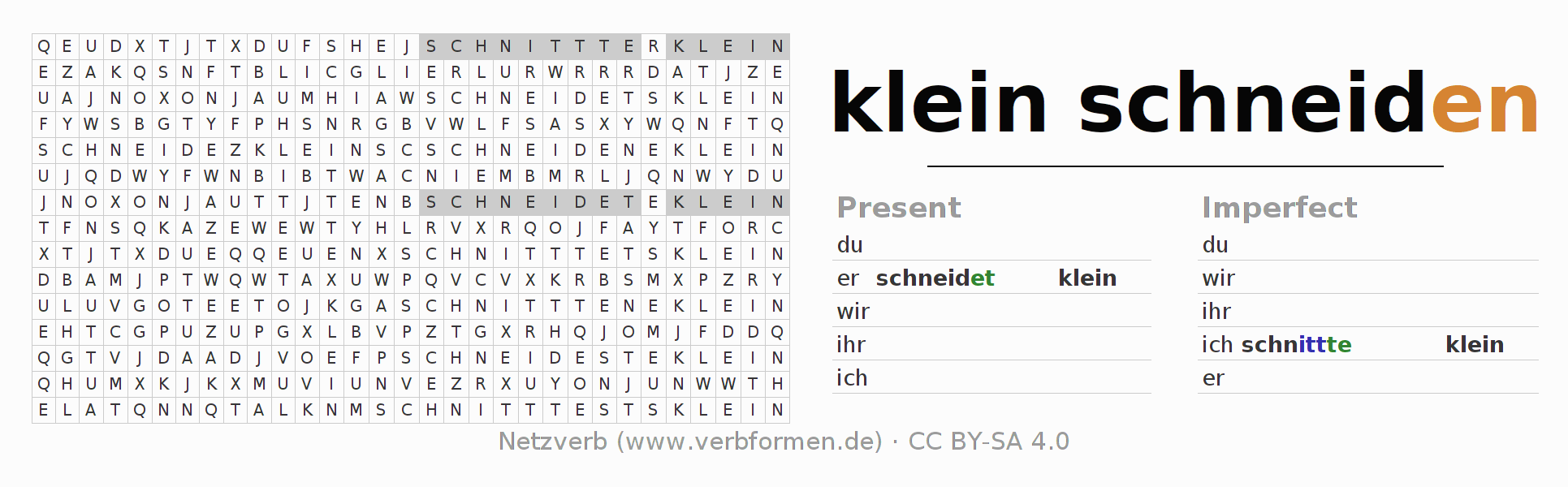 The word search puzzle for kleinschneiden or short word search is used to playfully learn German conjugation. First of all, the individual verb forms of the verb kleinschneiden must be created in order to find them in the letter grid. The reverse way is also possible. If one finds a flected verb in the search word puzzle, it is necessary to find out which verb form can be assigned. For printing and downloading, there is a PDF version or an image. There are also many more worksheets for the verb kleinschneiden. All materials are available as Open Educational Resources (OER) under license CC BY- SA 4.0 and can be used free of charge.