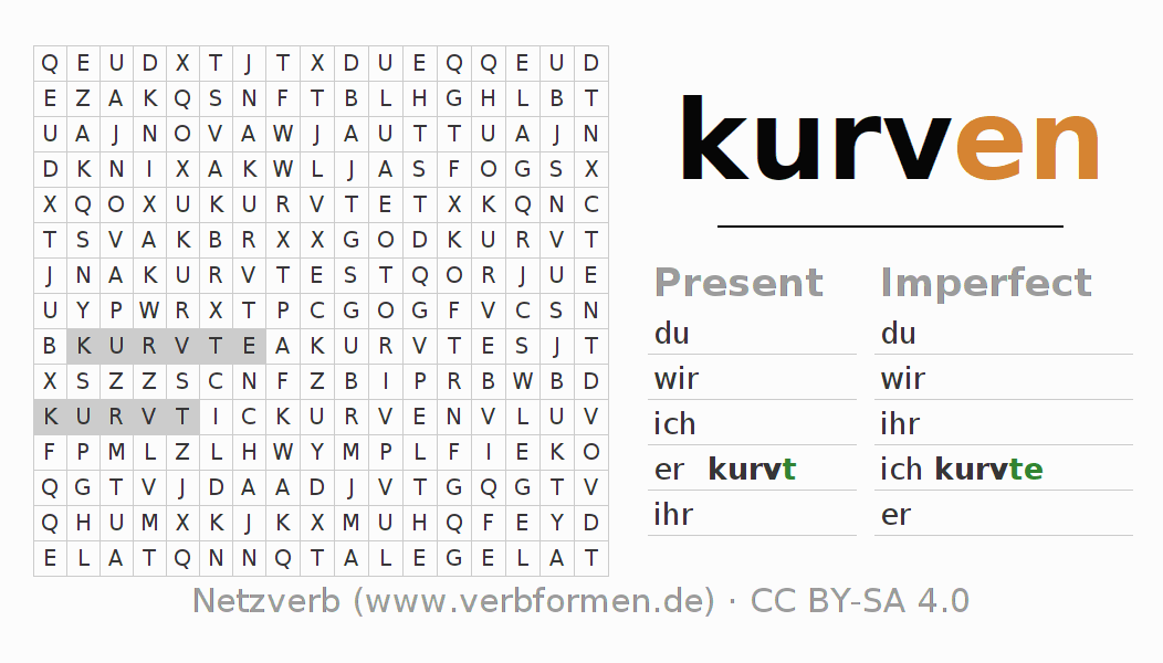 Instruction: Form the verb kurven and find it in the puzzle. Or recognize the flected form of kurven in the riddle and assign it to the correct verb form. Umlauts and ß are described as oe, ae and ue an ss.The solution is at the bottom of the page.