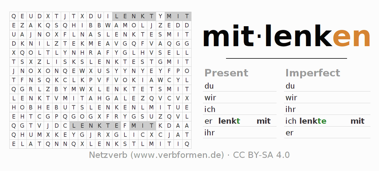The word search puzzle for mitlenken or short word search is used to playfully learn German conjugation. First of all, the individual verb forms of the verb mitlenken must be created in order to find them in the letter grid. The reverse way is also possible. If one finds a flected verb in the search word puzzle, it is necessary to find out which verb form can be assigned. For printing and downloading, there is a PDF version or an image. There are also many more worksheets for the verb mitlenken. All materials are available as Open Educational Resources (OER) under license CC BY- SA 4.0 and can be used free of charge.