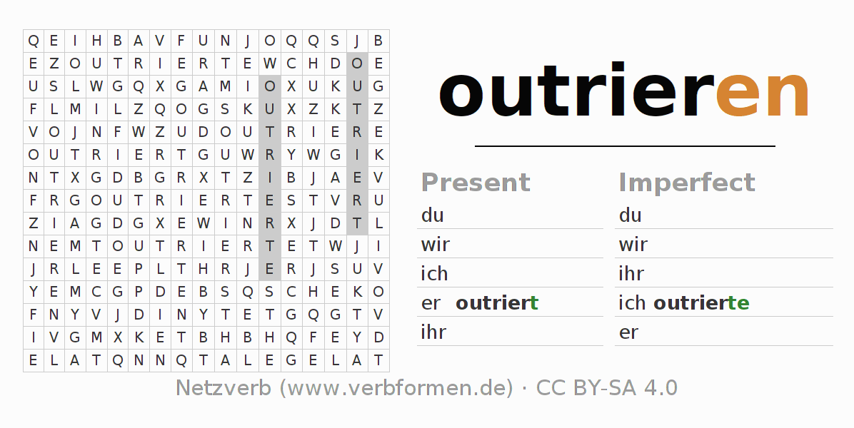 The word search puzzle for outrieren or short word search is used to playfully learn German conjugation. First of all, the individual verb forms of the verb outrieren must be created in order to find them in the letter grid. The reverse way is also possible. If one finds a flected verb in the search word puzzle, it is necessary to find out which verb form can be assigned. For printing and downloading, there is a PDF version or an image. There are also many more worksheets for the verb outrieren. All materials are available as Open Educational Resources (OER) under license CC BY- SA 4.0 and can be used free of charge.