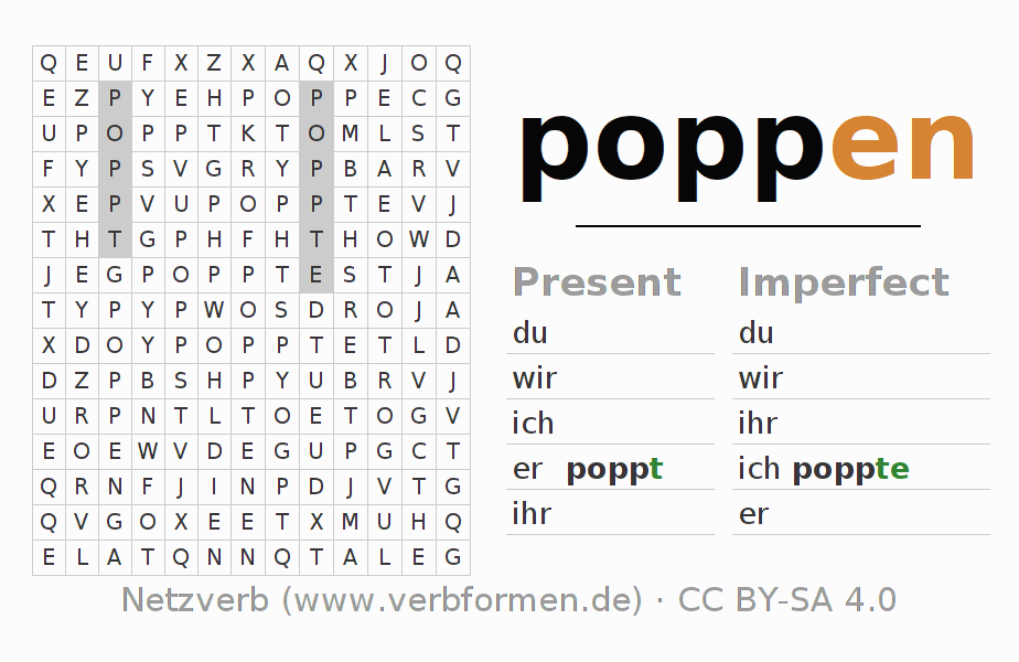 Instruction: Form the verb poppen and find it in the puzzle. Or recognize the flected form of poppen in the riddle and assign it to the correct verb form. Umlauts and ß are described as oe, ae and ue an ss.The solution is at the bottom of the page.