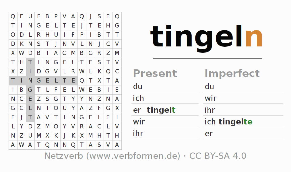 The word search puzzle for tingeln or short word search is used to playfully learn German conjugation. First of all, the individual verb forms of the verb tingeln (ist) must be created in order to find them in the letter grid. The reverse way is also possible. If one finds a flected verb in the search word puzzle, it is necessary to find out which verb form can be assigned. For printing and downloading, there is a PDF version or an image. There are also many more worksheets for the verb tingeln. All materials are available as Open Educational Resources (OER) under license CC BY- SA 4.0 and can be used free of charge.