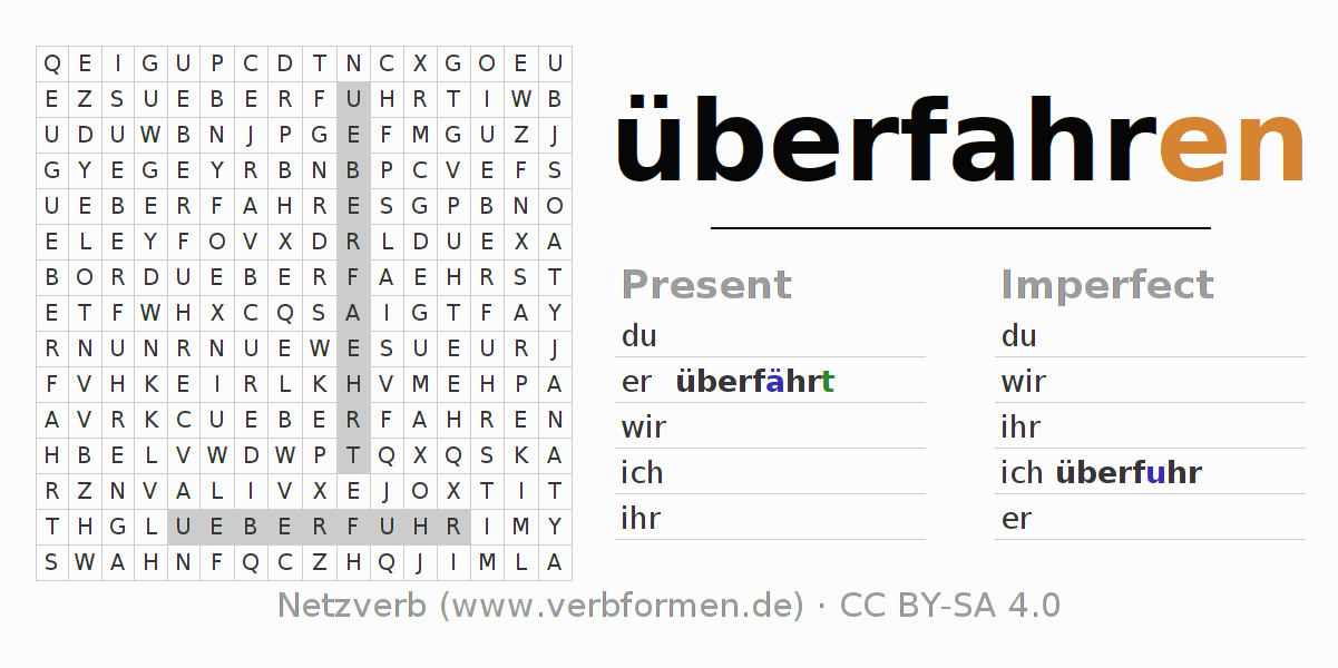 Instruction: Form the verb überfahren and find it in the puzzle. Or recognize the flected form of überfahren in the riddle and assign it to the correct verb form. Umlauts and ß are described as oe, ae and ue an ss.The solution is at the bottom of the page.