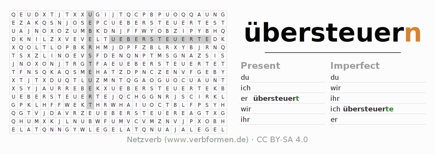 The word search puzzle for übersteuern or short word search is used to playfully learn German conjugation. First of all, the individual verb forms of the verb übersteuern must be created in order to find them in the letter grid. The reverse way is also possible. If one finds a flected verb in the search word puzzle, it is necessary to find out which verb form can be assigned. For printing and downloading, there is a PDF version or an image. There are also many more worksheets for the verb übersteuern. All materials are available as Open Educational Resources (OER) under license CC BY- SA 4.0 and can be used free of charge.