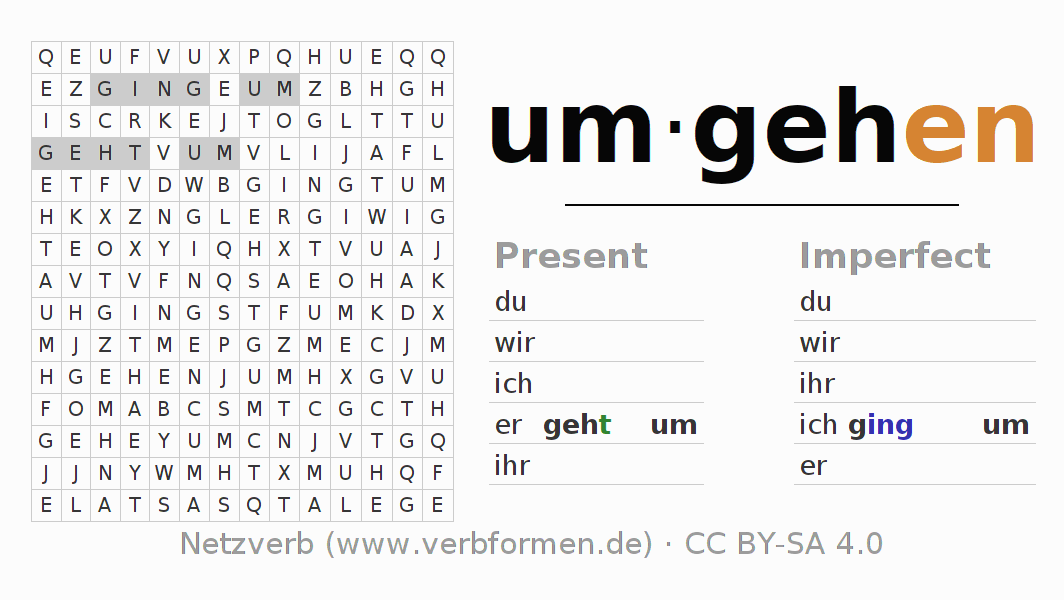 The word search puzzle for umgehen or short word search is used to playfully learn German conjugation. First of all, the individual verb forms of the verb um-gehen (ist) must be created in order to find them in the letter grid. The reverse way is also possible. If one finds a flected verb in the search word puzzle, it is necessary to find out which verb form can be assigned. For printing and downloading, there is a PDF version or an image. There are also many more worksheets for the verb umgehen. All materials are available as Open Educational Resources (OER) under license CC BY- SA 4.0 and can be used free of charge.