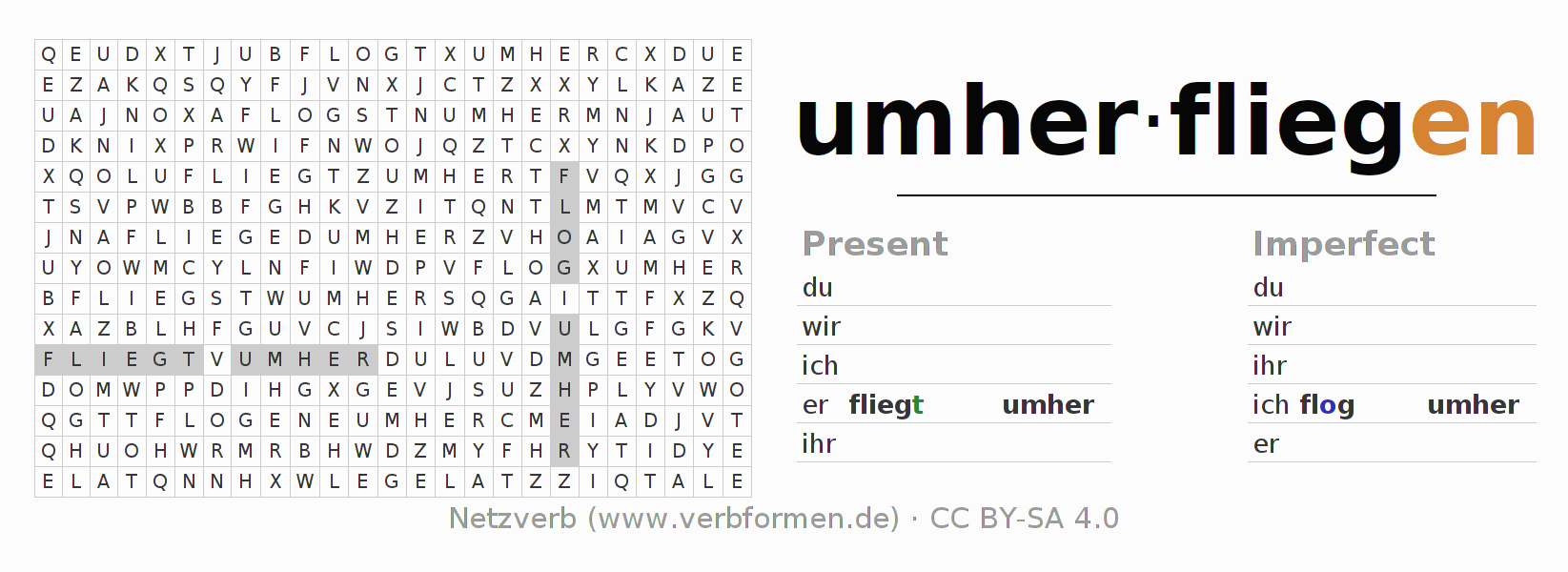 Instruction: Form the verb umherfliegen and find it in the puzzle. Or recognize the flected form of umherfliegen in the riddle and assign it to the correct verb form. Umlauts and ß are described as oe, ae and ue an ss.The solution is at the bottom of the page.