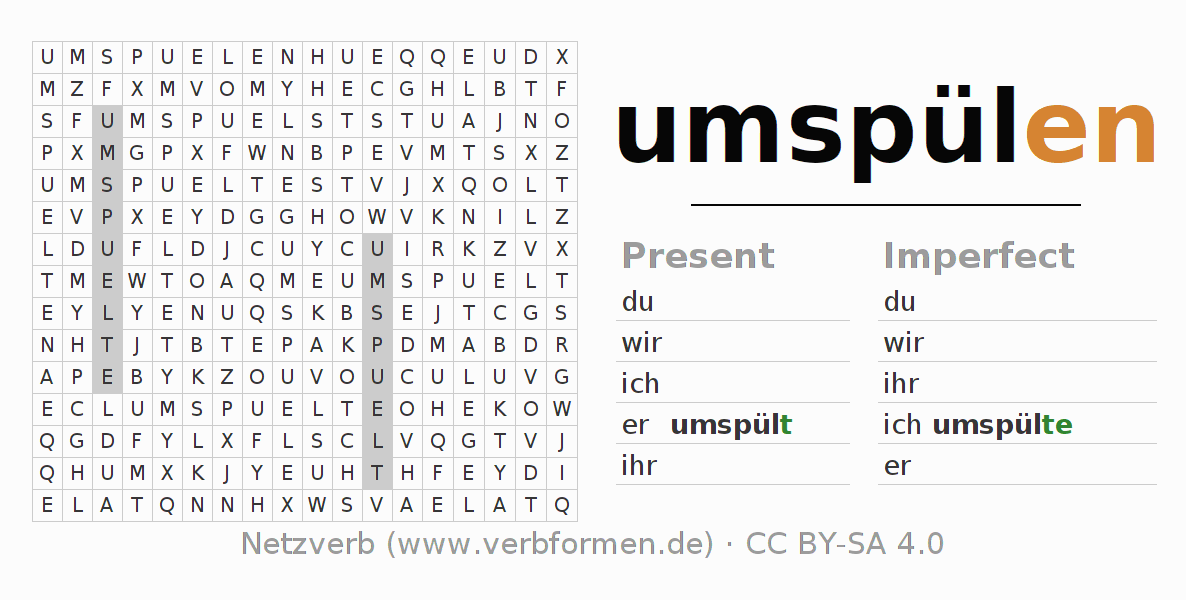The word search puzzle for umspülen or short word search is used to playfully learn German conjugation. First of all, the individual verb forms of the verb umspülen must be created in order to find them in the letter grid. The reverse way is also possible. If one finds a flected verb in the search word puzzle, it is necessary to find out which verb form can be assigned. For printing and downloading, there is a PDF version or an image. There are also many more worksheets for the verb umspülen. All materials are available as Open Educational Resources (OER) under license CC BY- SA 4.0 and can be used free of charge.