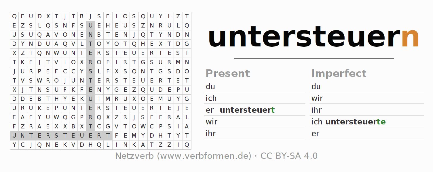 The word search puzzle for untersteuern or short word search is used to playfully learn German conjugation. First of all, the individual verb forms of the verb untersteuern must be created in order to find them in the letter grid. The reverse way is also possible. If one finds a flected verb in the search word puzzle, it is necessary to find out which verb form can be assigned. For printing and downloading, there is a PDF version or an image. There are also many more worksheets for the verb untersteuern. All materials are available as Open Educational Resources (OER) under license CC BY- SA 4.0 and can be used free of charge.