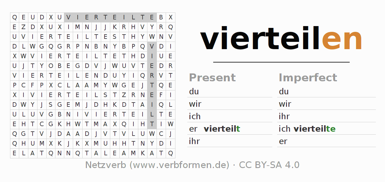 Instruction: Form the verb vierteilen and find it in the puzzle. Or recognize the flected form of vierteilen in the riddle and assign it to the correct verb form. Umlauts and ß are described as oe, ae and ue an ss.The solution is at the bottom of the page.