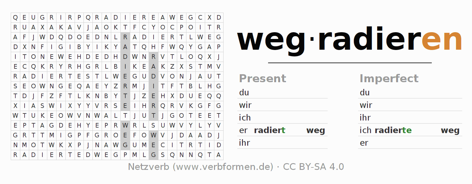 Instruction: Form the verb wegradieren and find it in the puzzle. Or recognize the flected form of wegradieren in the riddle and assign it to the correct verb form. Umlauts and ß are described as oe, ae and ue an ss.The solution is at the bottom of the page.
