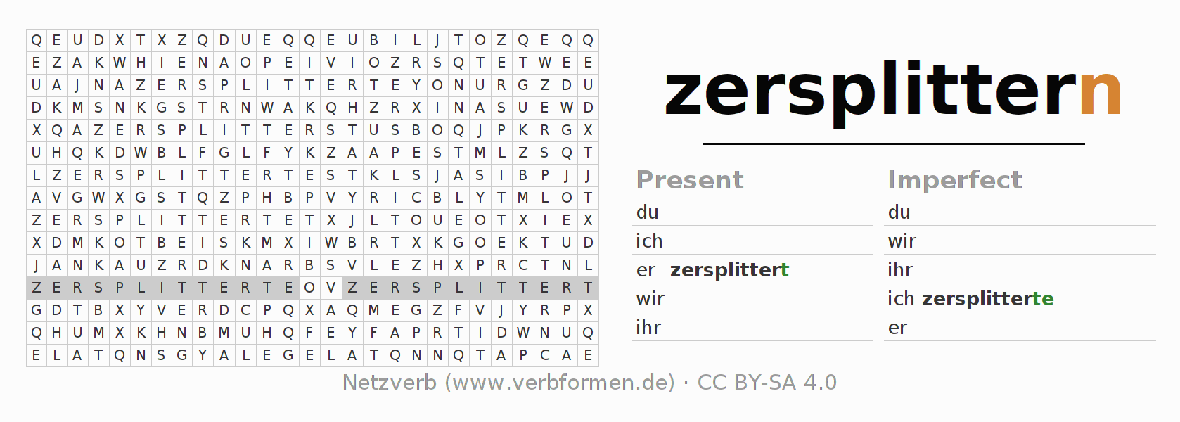 The word search puzzle for zersplittern or short word search is used to playfully learn German conjugation. First of all, the individual verb forms of the verb zersplittern (ist) must be created in order to find them in the letter grid. The reverse way is also possible. If one finds a flected verb in the search word puzzle, it is necessary to find out which verb form can be assigned. For printing and downloading, there is a PDF version or an image. There are also many more worksheets for the verb zersplittern. All materials are available as Open Educational Resources (OER) under license CC BY- SA 4.0 and can be used free of charge.