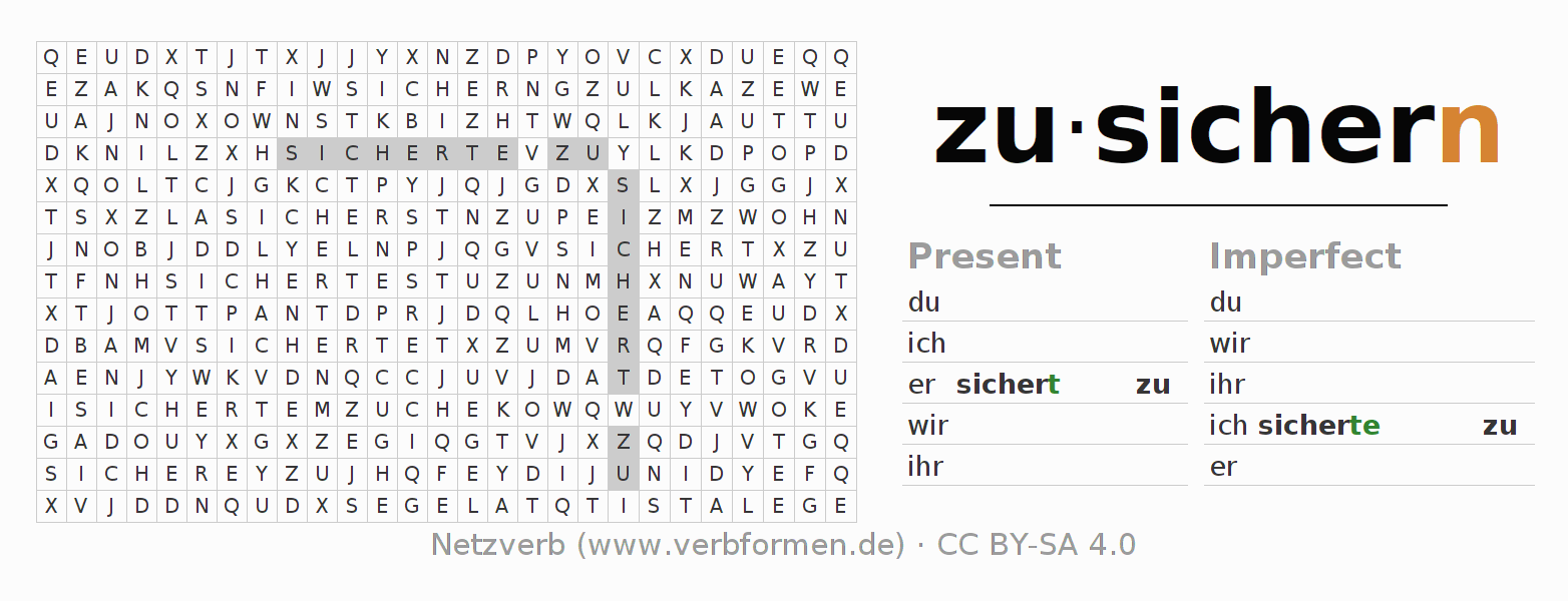 The word search puzzle for zusichern or short word search is used to playfully learn German conjugation. First of all, the individual verb forms of the verb zusichern must be created in order to find them in the letter grid. The reverse way is also possible. If one finds a flected verb in the search word puzzle, it is necessary to find out which verb form can be assigned. For printing and downloading, there is a PDF version or an image. There are also many more worksheets for the verb zusichern. All materials are available as Open Educational Resources (OER) under license CC BY- SA 4.0 and can be used free of charge.