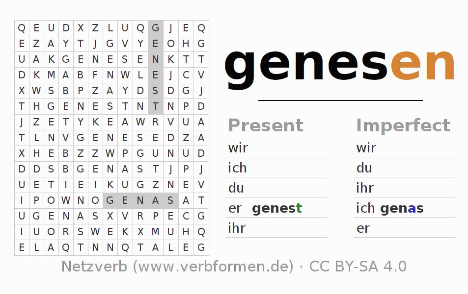 Instruction: Form the verb genesen and find it in the puzzle. Or recognize the flected form of genesen in the riddle and assign it to the correct verb form. Umlauts and ß are described as oe, ae and ue an ss.The solution is at the bottom of the page.