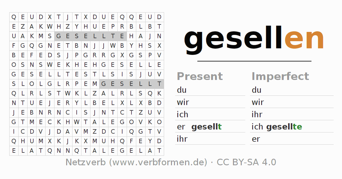 The word search puzzle for gesellen or short word search is used to playfully learn German conjugation. First of all, the individual verb forms of the verb gesellen must be created in order to find them in the letter grid. The reverse way is also possible. If one finds a flected verb in the search word puzzle, it is necessary to find out which verb form can be assigned. For printing and downloading, there is a PDF version or an image. There are also many more worksheets for the verb gesellen. All materials are available as Open Educational Resources (OER) under license CC BY- SA 4.0 and can be used free of charge.