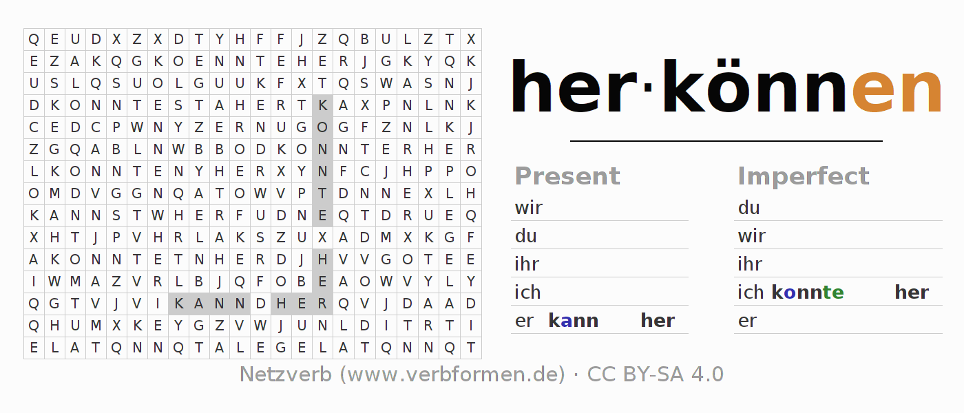 Instruction: Form the verb herkönnen and find it in the puzzle. Or recognize the flected form of herkönnen in the riddle and assign it to the correct verb form. Umlauts and ß are described as oe, ae and ue an ss.The solution is at the bottom of the page.