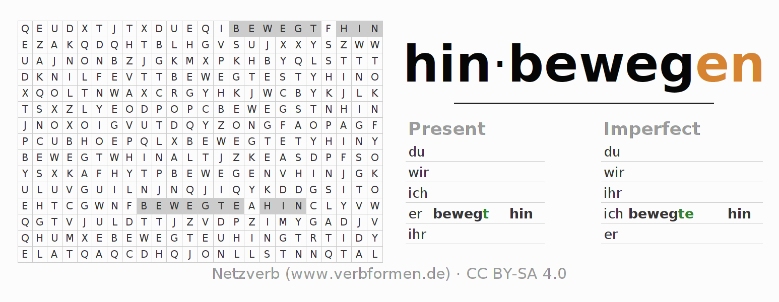 The word search puzzle for hinbewegen or short word search is used to playfully learn German conjugation. First of all, the individual verb forms of the verb hinbewegen must be created in order to find them in the letter grid. The reverse way is also possible. If one finds a flected verb in the search word puzzle, it is necessary to find out which verb form can be assigned. For printing and downloading, there is a PDF version or an image. There are also many more worksheets for the verb hinbewegen. All materials are available as Open Educational Resources (OER) under license CC BY- SA 4.0 and can be used free of charge.