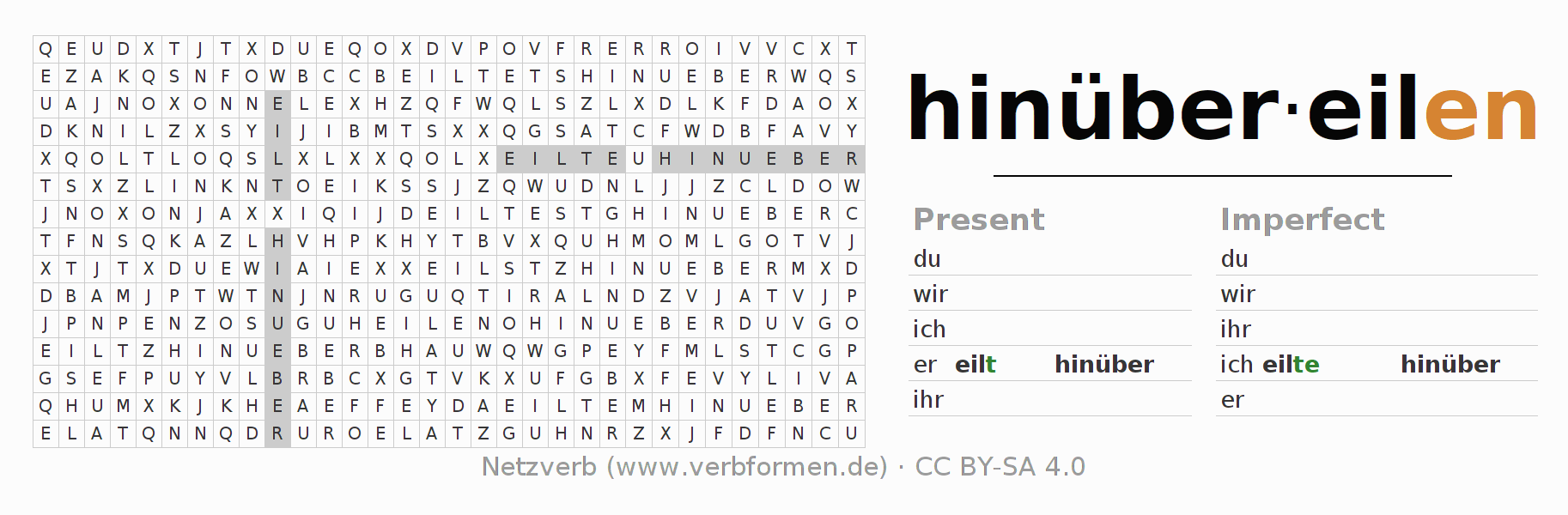 The word search puzzle for hinübereilen or short word search is used to playfully learn German conjugation. First of all, the individual verb forms of the verb hinübereilen must be created in order to find them in the letter grid. The reverse way is also possible. If one finds a flected verb in the search word puzzle, it is necessary to find out which verb form can be assigned. For printing and downloading, there is a PDF version or an image. There are also many more worksheets for the verb hinübereilen. All materials are available as Open Educational Resources (OER) under license CC BY- SA 4.0 and can be used free of charge.