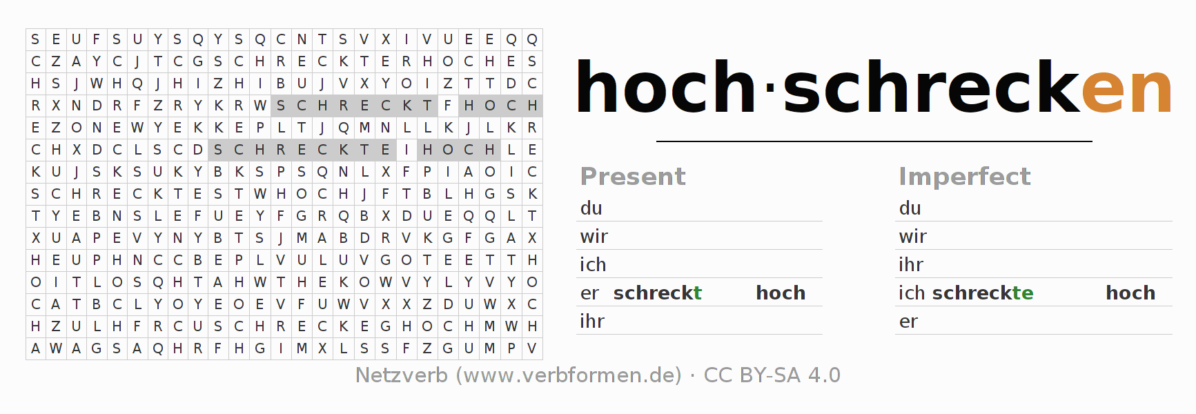 The word search puzzle for hochschrecken or short word search is used to playfully learn German conjugation. First of all, the individual verb forms of the verb hochschrecken (regelm) (ist) must be created in order to find them in the letter grid. The reverse way is also possible. If one finds a flected verb in the search word puzzle, it is necessary to find out which verb form can be assigned. For printing and downloading, there is a PDF version or an image. There are also many more worksheets for the verb hochschrecken. All materials are available as Open Educational Resources (OER) under license CC BY- SA 4.0 and can be used free of charge.