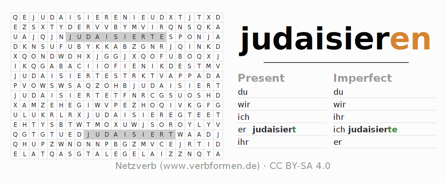 The word search puzzle for judaisieren or short word search is used to playfully learn German conjugation. First of all, the individual verb forms of the verb judaisieren must be created in order to find them in the letter grid. The reverse way is also possible. If one finds a flected verb in the search word puzzle, it is necessary to find out which verb form can be assigned. For printing and downloading, there is a PDF version or an image. There are also many more worksheets for the verb judaisieren. All materials are available as Open Educational Resources (OER) under license CC BY- SA 4.0 and can be used free of charge.